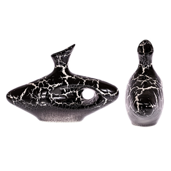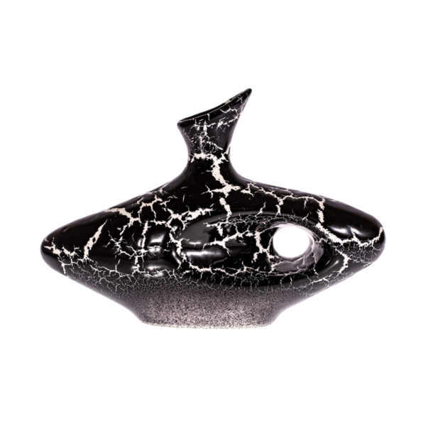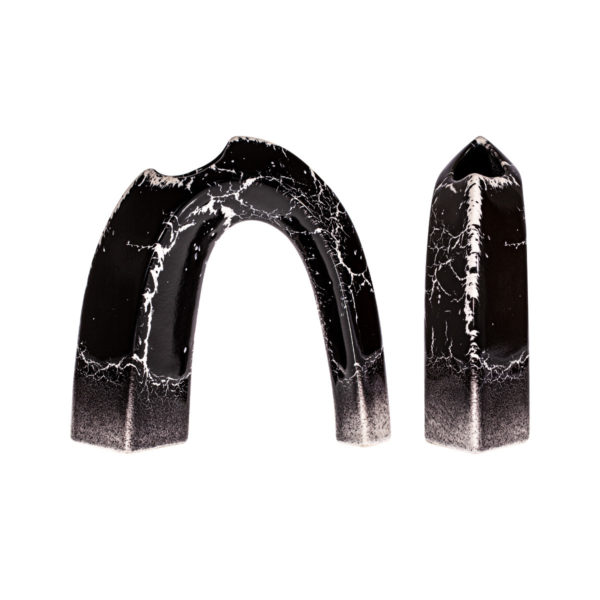 Originálna keramická váza, je odliata v dvojdielnej forme z bielej keramickej hliny. Po vyschnutí a vybratí z formy je vytvorený nástrek originálnou glazúrov čierno-bielej farby. Jej atypický vzhľad a atypické zafarbenie módne doplní moderný nábytok v čierno bielom spojení. Spojením farby a glazúry vznikne originálny a jedinečný vzhľad každej vázy.