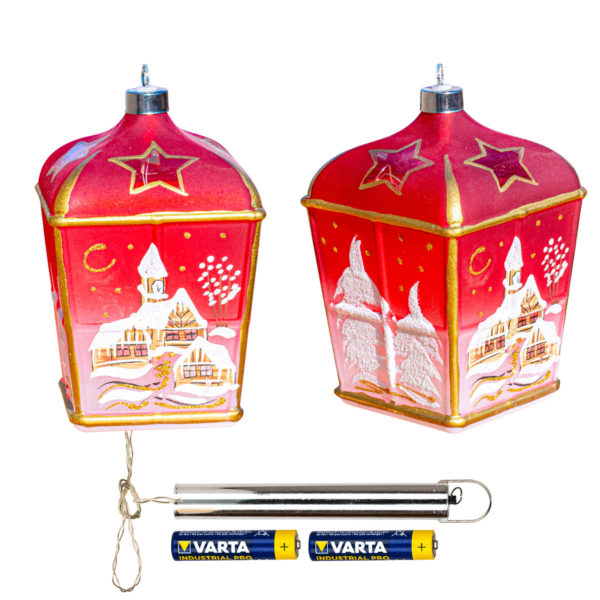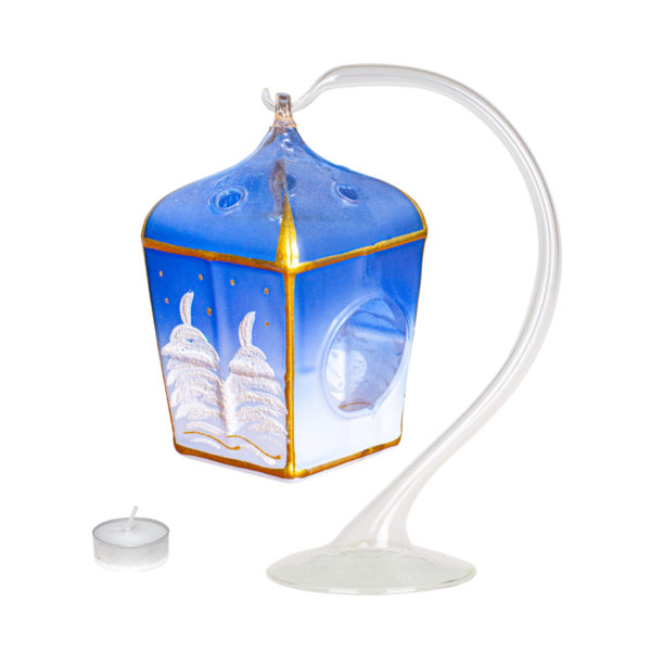 Lucerna Na Sviečku - je novinka z roku 2021. Lucerna je vyrobená vo forme z jemného fúkaného skla. V zadnej časti sa nachádza otvor pre čajovú sviečku. Sviečka sa najskôr vloží do lucerny a následne zapáli. Používajú sa len čajové sviečky a tak nedochádza k zadýmeniu skla. Vo vrchnej časti sú otvory na odvod tepla. Lucerna sa dá krásne doplniť aj led svetlom ktoré sa vloži do lucerny. Celé je to zavesené na originalnom sklenenom stojančeku. Lucerna sa vyrába v štyroch základných farbách. modrá, červená, biela, zlatá. Na lucernu sa maľuje motív zimnej krajiny.