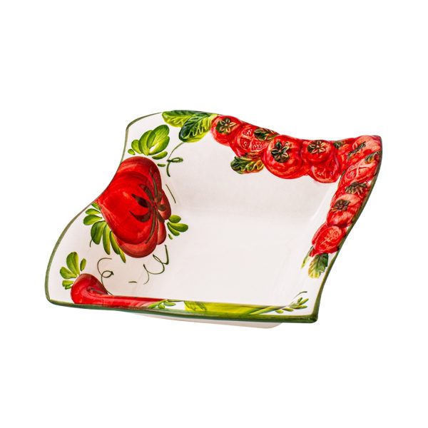 Tiresa Qudro -  je keramická miska na ovocie alebo iné veci v tvare štvorca. Moderná dostatočne hlboká štvorcová miska s hranami vlnkového tvaru. V jej okrajoch sú odliaté mini paradajky a na druhej časti misky sú paradajky ručne namaľované. Miska je krásne zladená čevenou a zelenou farbou a následne glazovaná. Originálna Talianska keramika z rodinných fabrík v Taliansku Vám okrem úžitku vyčarí úsmev na tvári a prinesie radosť pri servírovaní Vášho obľúbeného jedla. Keramika, ktorú vám ponúkame my sa vyrába už takmer 50 rokov. Jej tajomstvom úspechu je ,,amore,, Každý keramický kúsok je originálny a ručne maľovaný. vypaľuje sa 8 až 12 hodín pri vysokej teplote 960 °C až 1100°C vypaľuje sa 2 x v peci, prvý raz ako čistá forma ,,biscotto,, a druhý raz už maľovaný a glazúrovaný finálny produkt