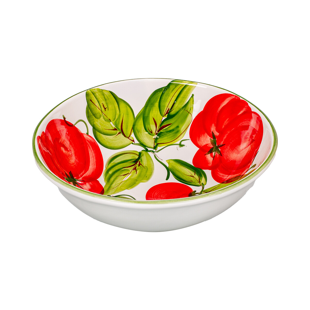 Belora – Táto nádherná, pestrofarebne maľovaná okrúhla misa hĺbká 10 cm  prinesie na váš stôl a vášeň slnkom zaliateho Talianska. Dominujú jej veľké, šťavnaté červené paradajky obklopené sviežimi zelenými listami, ktoré vytvárajú živý a živý motív. Intenzívna červená farba v kombinácii s lesklou glazúrou dodávame jedinečný šarm. Ideálna na servírovanie čerstvých šalátov, cestovín či ovocia.