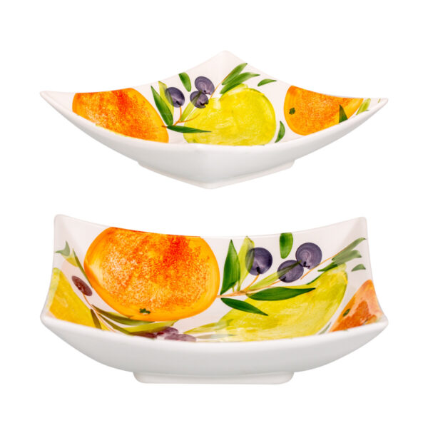 Corila – Stredná hlboká miska v sebe ukrýva čaro talianskych citrusových sadov a olivovníkov. Žiarivé oranžové pomaranče, svetložlté citróny a tmavofialové olivy, doplnené o nádherné zelené konáriky, vytvárajúcu stredomorskú kompozíciu. Ručne maľované detaily a lesklá glazúra dodávajú mi jedinečný šarm. Ideálna na servírovanie ovocia, šalátov či studených jedál – vnesie do vášho stolovania slnečnú energiu a vôňu-