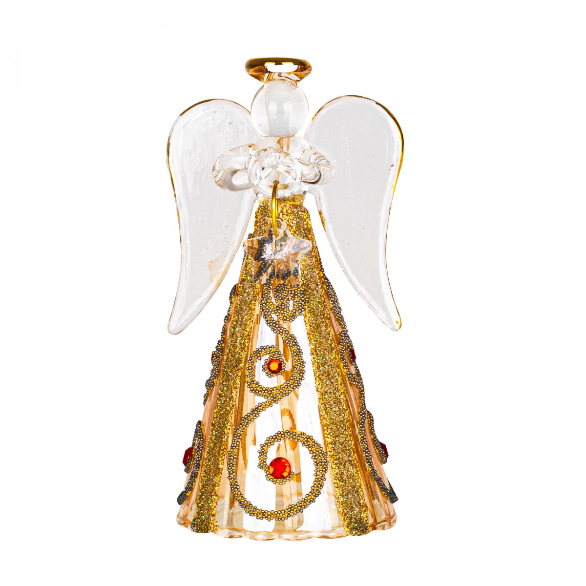 Fúkané jemné  sklo v tvare malého anjela.  Sklo je krásne maľované v rôznych farbách a motívoch. Farby sú doplnené o rôzne ligotavé ozdôbky. Dekoračný anjel je vhodný postaviť na rovnú poličku - plochu alebo je možné ho zavesiť na vianočný stromček. Anjel je zabalený do darčekovej krabičky s priesvitným vrchnákom a vystlané molitanom. Rozmery krabičky sú: 14 x 9 x 6 cm