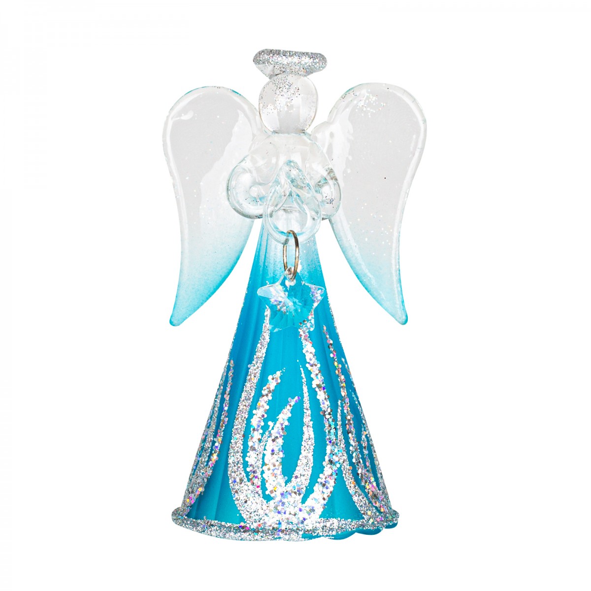 Fúkané jemné  sklo v tvare malého anjela.  Sklo je krásne maľované v rôznych farbách a motívoch. Farby sú doplnené o rôzne ligotavé ozdôbky. Dekoračný anjel je vhodný postaviť na rovnú poličku - plochu alebo je možné ho zavesiť na vianočný stromček. Anjel je zabalený do darčekovej krabičky s priesvitným vrchnákom a vystlané molitanom. Rozmery krabičky sú: 14 x 9 x 6 cm