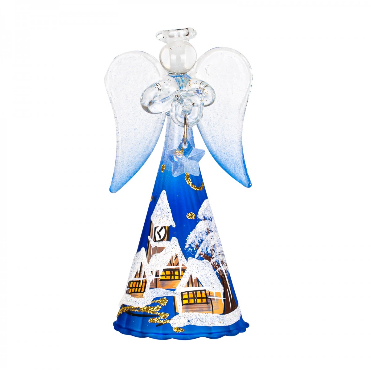 Fúkané jemné  sklo v tvare malého anjela.  Sklo je krásne maľované v rôznych farbách a motívoch. Farby sú doplnené o rôzne ligotavé ozdôbky. Dekoračný anjel je vhodný postaviť na rovnú poličku - plochu alebo je možné ho zavesiť na vianočný stromček. Anjel je zabalený do darčekovej krabičky s priesvitným vrchnákom a vystlané molitanom. Rozmery krabičky sú: 14 x 9 x 6 cm