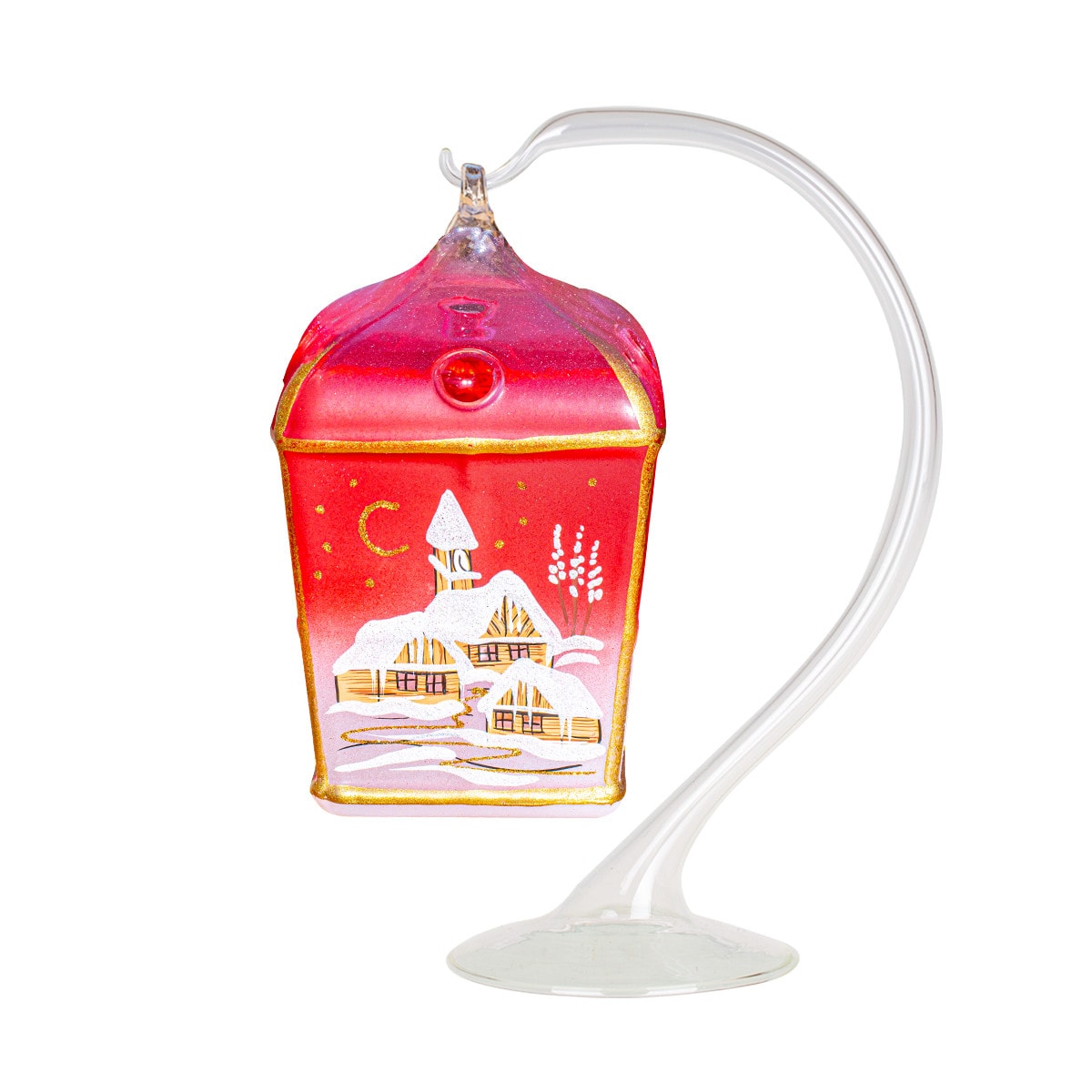 Lucerna Na Sviečku – je novinka z roku 2021. Lucerna je vyrobená vo forme z jemného fúkaného skla. V zadnej časti sa nachádza otvor pre čajovú sviečku. Sviečka sa najskôr vloží do lucerny a následne zapáli. Používajú sa len čajové sviečky a tak nedochádza k zadýmeniu skla. Vo vrchnej časti sú otvory na odvod tepla. Lucerna sa dá krásne doplniť aj led svetlom ktoré sa vloži do lucerny. Celé je to zavesené na originalnom sklenenom stojančeku. Lucerna sa vyrába v štyroch základných farbách. modrá, červená, biela, zlatá. Na lucernu sa maľuje motív zimnej krajiny.