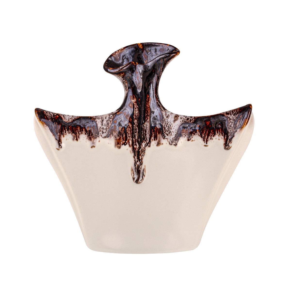 Manekin Váza Krémová - je atypická ploská váza vhodná aj pre suché kvety a aj pre živé. Može byť aj pekná dekorácia. Originálna keramická váza, je odliata v dvojdielnej forme z bielej keramickej hliny. Po vyschnutí a vybratí z formy je vytvorený nástrek hnedou práškovou farbou a následne je váza aj glazovaná. Glazúra je nanesená z vonka aj zvnútra a tým sa zabezpečí nepriepustnosť vody. Spojením farby a glazúry vznikne originálny a jedinečný vzhľad každej vázy. Váza neprepúšťa vodu.
