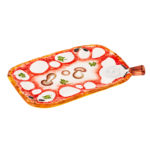Melota –  je krásny červený  rovný pizza podnos s krasne opečeným a sfarbeným okrajom na kúsky čerstvej pečenej pizze. Podnos vhodný aj pre servírovanie syra pizze aj ako podklad na krájanie rôznych pokrmov. . Má design aj farbu čerstvo upečenej pizze a je  doplnená syr a hríby.  Podnos  je  vhodný k servírovaniu jedla.