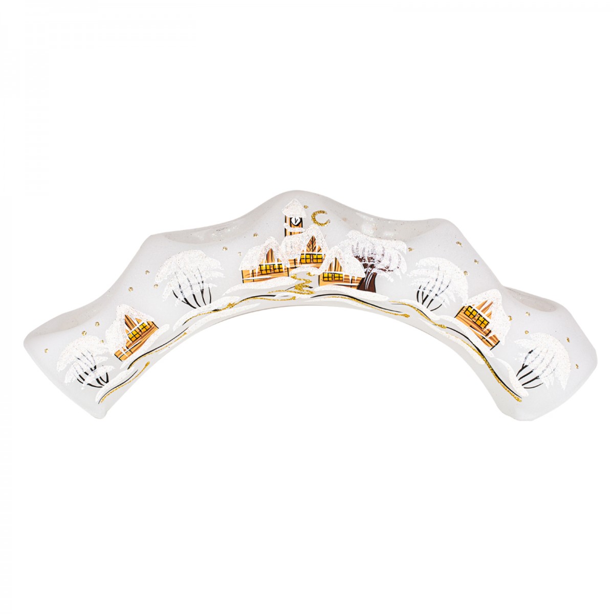 Do zimnej vianočnej atmosféry je v ponuke sklenený svietnik v tvare valca a vytvarovaného do oblúku.  Valec je jemné fúkané sklo na ktoré sa ručne maľuje zimná krajinka na motív slovenskej dedinky.  Maľuje sa v štyroch farbách:  Modrá, Červená, Biela, Zlatá.