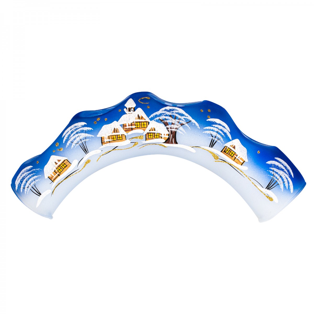 Do zimnej vianočnej atmosféry je v ponuke sklenený svietnik v tvare valca a vytvarovaného do oblúku.  Valec je jemné fúkané sklo na ktoré sa ručne maľuje zimná krajinka na motív slovenskej dedinky.  Maľuje sa v štyroch farbách:  Modrá, Červená, Biela, Zlatá.