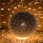 Prekrásna lampa z prírodného materiálu pre romantickú atmosféru. Oceňujem kombináciu elektrická žiarovka a aj obyčajná čajová sviečka – bodky na stene plápolajú ako plameň sviečky. Privítala by som aj rotačný podstavec