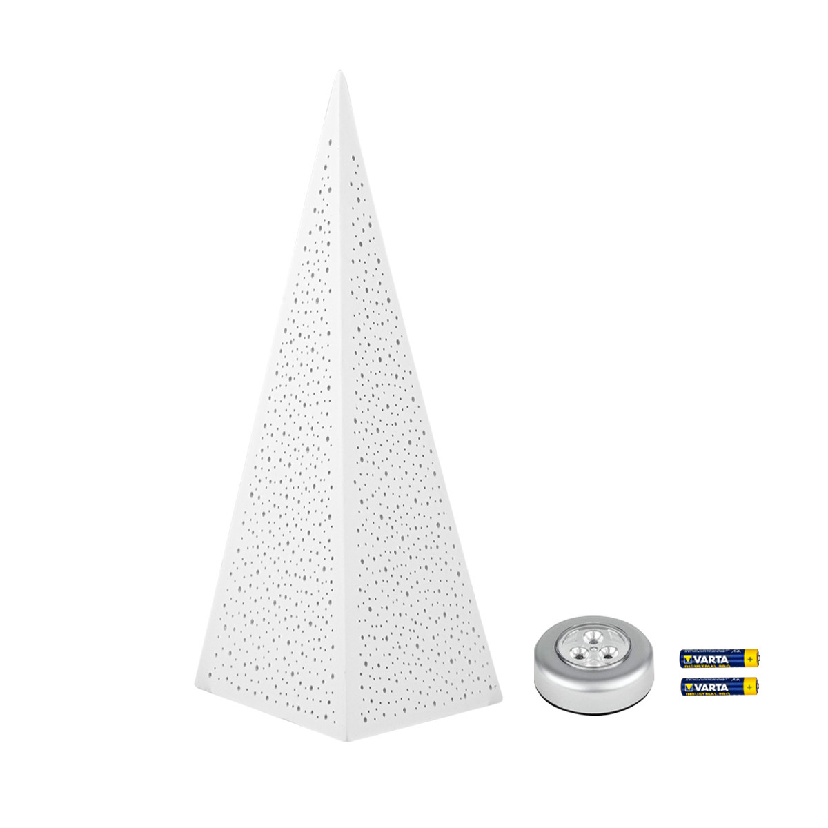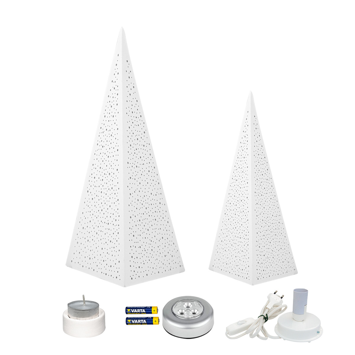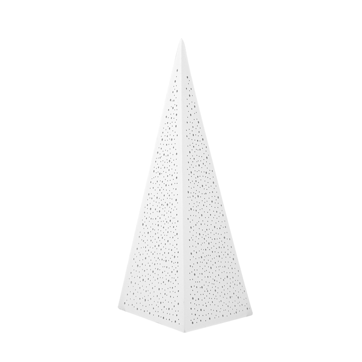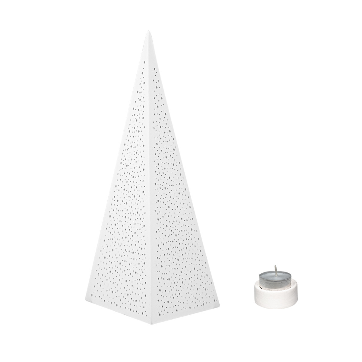 PYRAMIDE  IHLAN – je originálna lampa v tvare ihlanu. Má trojuholníkovú základňu a je na výber s 2 veľkostí. Lampa alebo svietnik má ostré hrany ktoré krásne  dotvoria priestor kde budú položené. Tvar ihlanu je jednoduchý čistý a je v bielej nestarnucej farbe. Je vyrobená z bielej hliny, ktorá je odliata do formy a ručne vydierkovaná. Dierky sú vytvorené tromi veľkosťami. Lampa je vypálená v peci a ručne obrúsená. Tento originálny doplnok je doplnený o sviečku a misku,je možnosť použitia elektrického kábla.