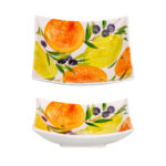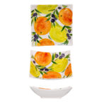 Sofeta – Táto stredne hlboká štvorcová miska je oslavou farieb a chutí Stredomoria. Žiarivé oranžové pomaranče, svetložlté citróny a tmavo olivy, prepojené zelenými konárikmi, vytvárajú nádherné krásne fialové motívy, ktoré prinášajú do vášho domova slnečného juhu. Precízna ručná maľba a lesklá glazúra zdôrazňujú jedinečnosť každého kusu. Perfektná na servírovanie ovocia či šalátov  – dodá vášmu stolovaniu nádych talianskej elegancie.