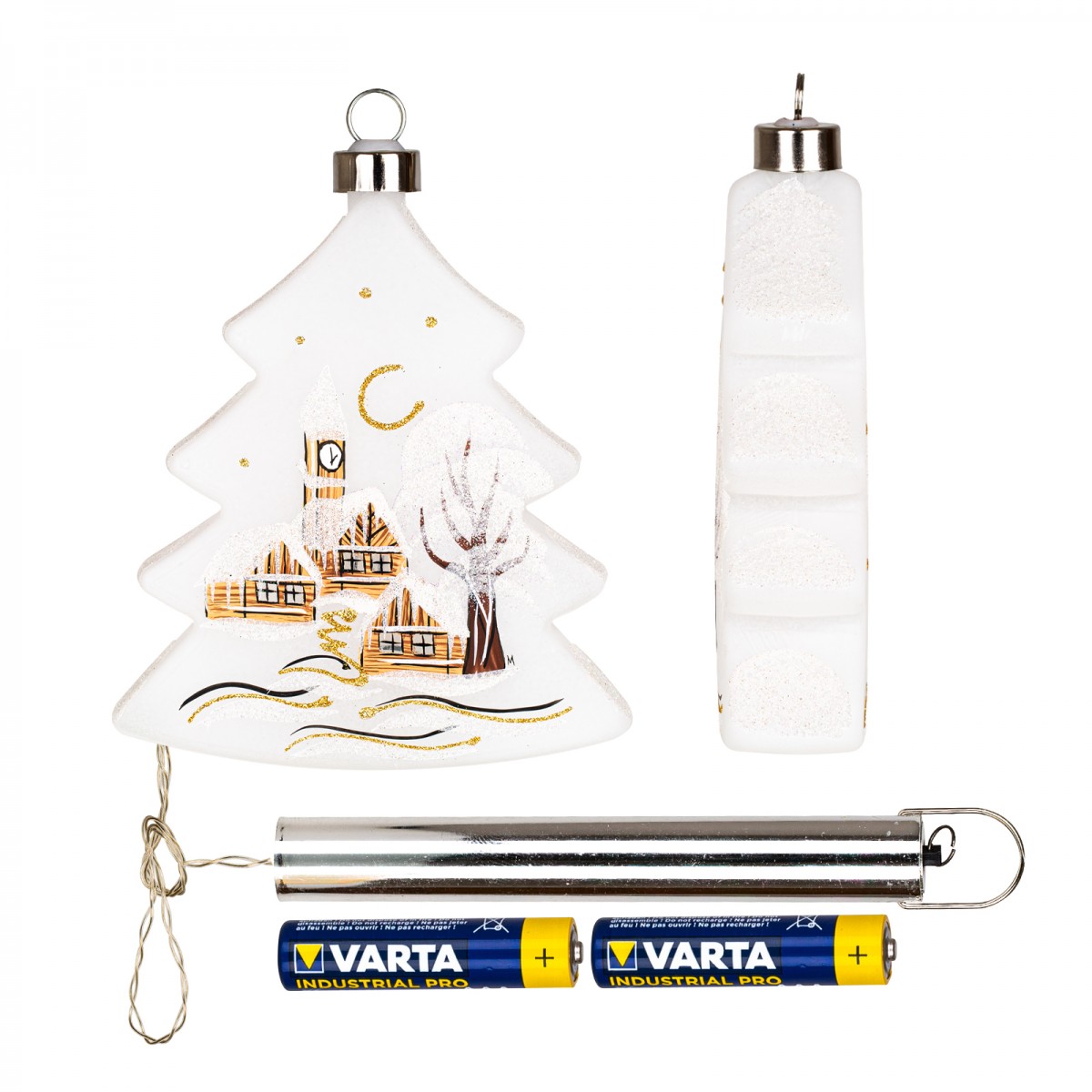 Stromček LED sa maľuje na motív zimnej krajiny. Vo vnútri je stromček dutý a malým LED káblikom je do vnútra dovedené svetlo. Malé drôtové svetelné diody sú napájané z dvoch tuškových bateriek typ AA.