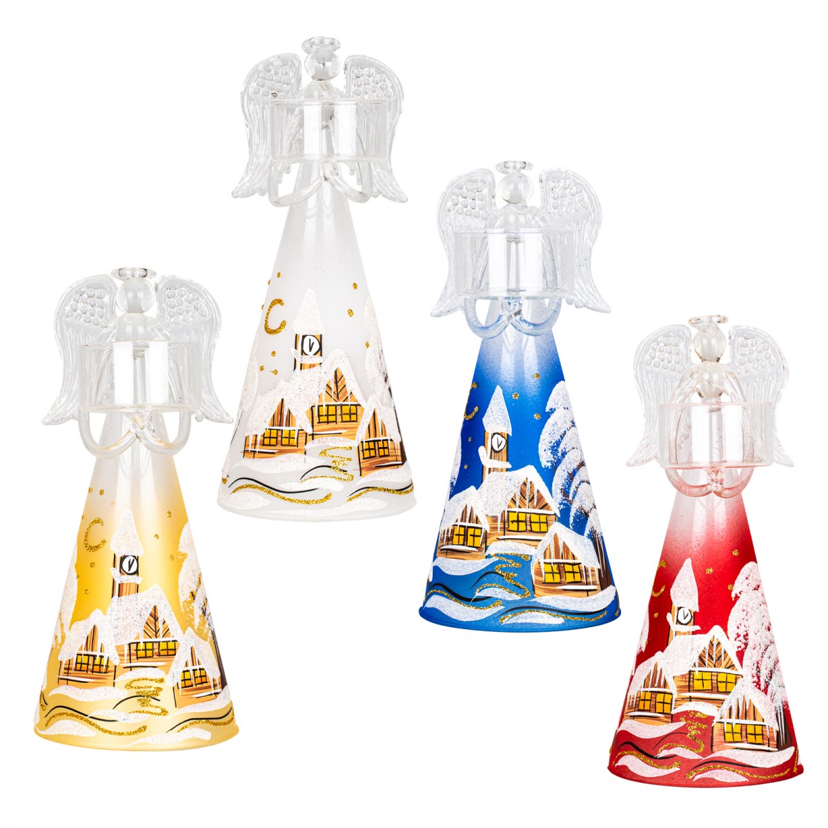 Štyri farby anjelov  sú doplnené o rôzne ligotavé ozdôbky.   Anjel drží v rukách misku na čajovú sviečku.