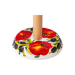 Titolare – držiak na papierové utierky alebo kuchynské utierky. Praktický držiak na celú rolku kuchynských obrúskov skladajúci sa s dolnej ručne maľovanej keramiky a drevenej časti na ktorej je navlieknutá rolka. Motívom maľby je klasika medzi talianskými motívmi a to je rajčiny paradajky a tmavé olivy. Praktický kuchynský doplnok na kuchynskú linku.